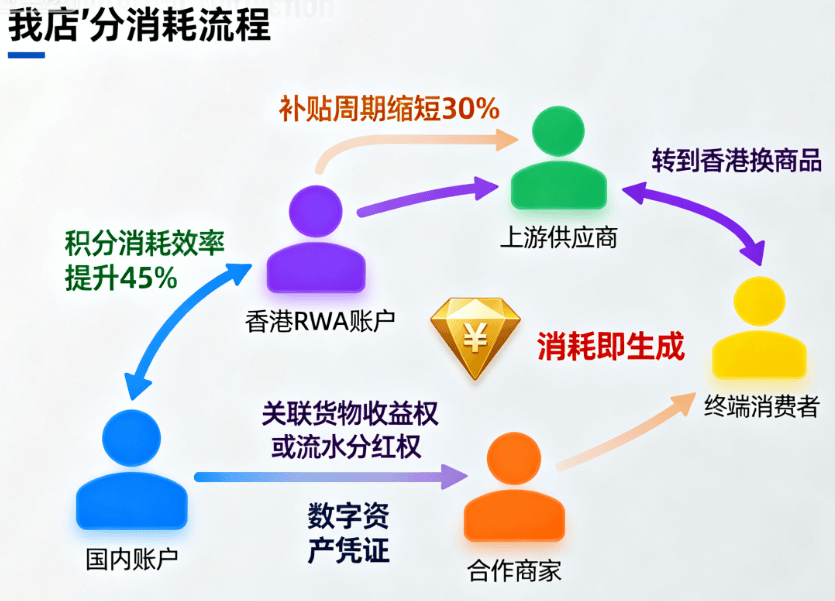 举个例子:供应商 A 给 “我店” 供了 100 万的货,拿了 20 万积分补贴。以前这 20 万积分只能在国内慢慢用,现在能转到香港换商品,消耗积分的同时拿到 “数字资产凭证”,未来还能分到其他商家的流水分红。