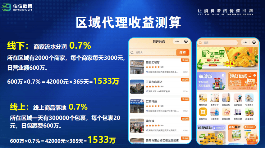 交一定平台使用费,负责本区域商家和商务的服务,就能赚区域内所有商家营业额的 0.7%(线上商品也算),做得好的话年收益能到千万级别。