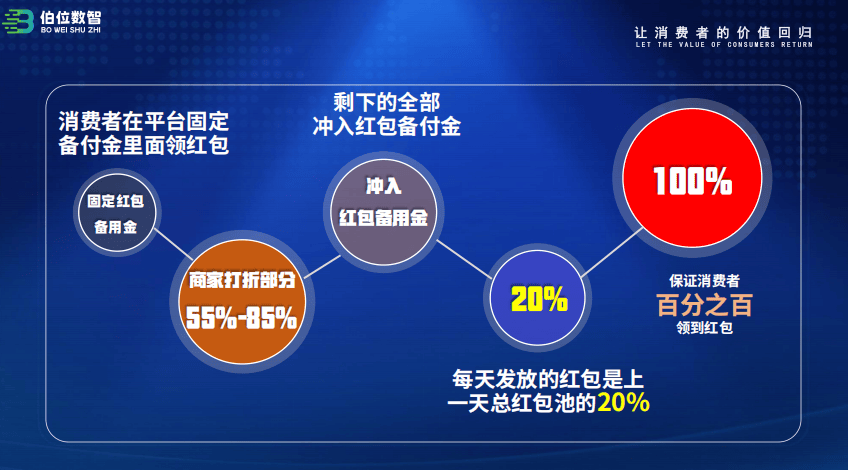商家让利的钱会二次分配:50% 给消费者当红包,30% 给商务团队当推广佣金,20% 留作平台技术维护费。平台每天只发红包池里 20% 的钱,保证资金能持续运转,还能留部分钱扩张。