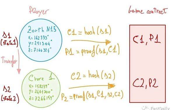 Dark Forest是一款完全链上的在线游戏,率先使用zkSNARKs来保护游戏内信息的私密性。在DF中,玩家在无限的宇宙中发现并征服行星。但是,他们不需要提交他们征服的行星的坐标。否则,它们将被利用。相反,玩家提交坐标的哈希值和本地生成的零知识证明附件。同样,每当他们想从行星A移动到行星B时,他们都需要提供两颗行星坐标的哈希值和相应的zk证明。只有玩家知道这些坐标和状态转换,因为它们存储在本地,每个外部用户只能看到哈希和zk证明。