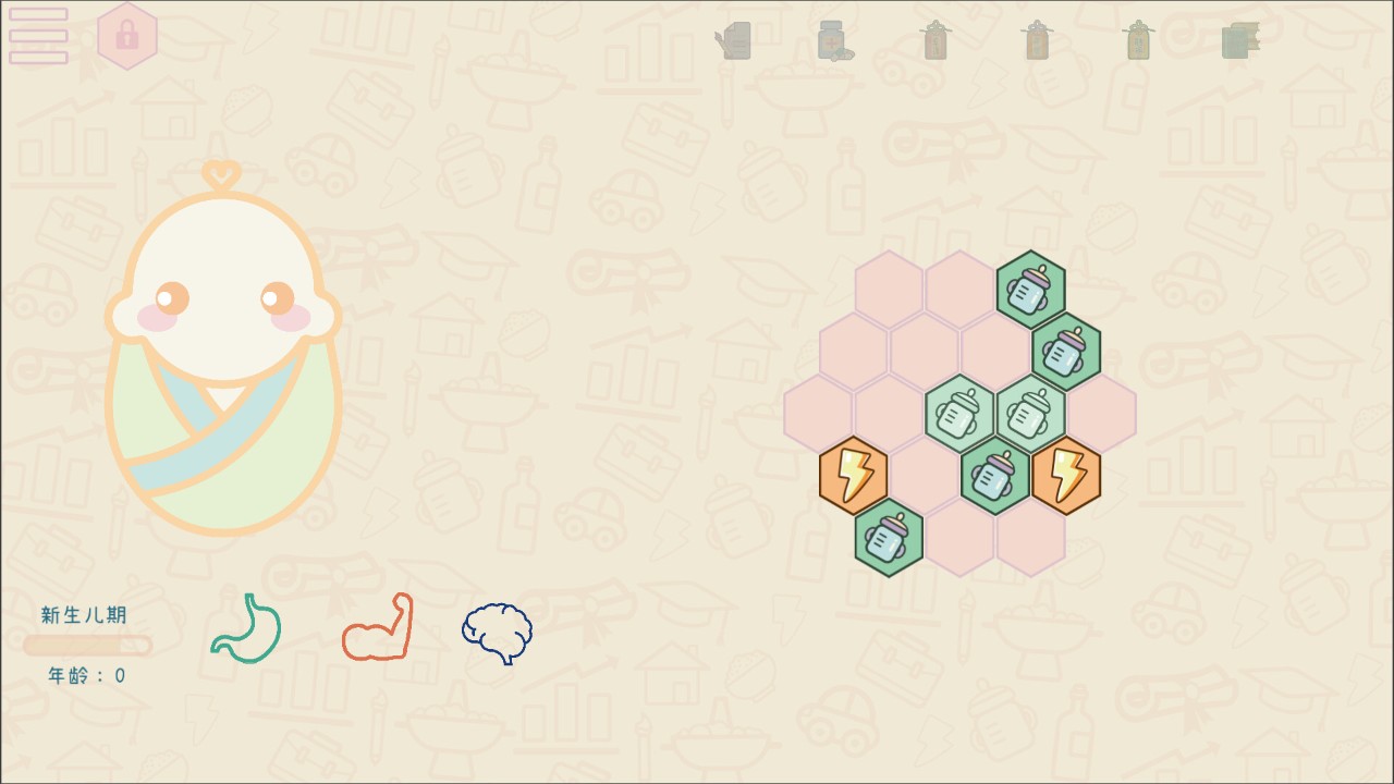 踏入一场以生存为名的智慧博弈,在色彩斑斓的三消棋盘间,用指尖滑动串联起营养、健康与技能的资源链。随着角色年龄数字的攀升,屏幕中的世界逐渐染上岁月痕迹——疾病图标如暗云浮动,压力事件化作突袭的闪电,而每一次消除匹配都在为生命续航。从稚嫩孩童到百岁长者,17种生命元素与10种日常事件交织成网,搭配Steam十项成就的收集挑战,让这场关于苟活的冒险在轻松画风下暗藏硬核策略。