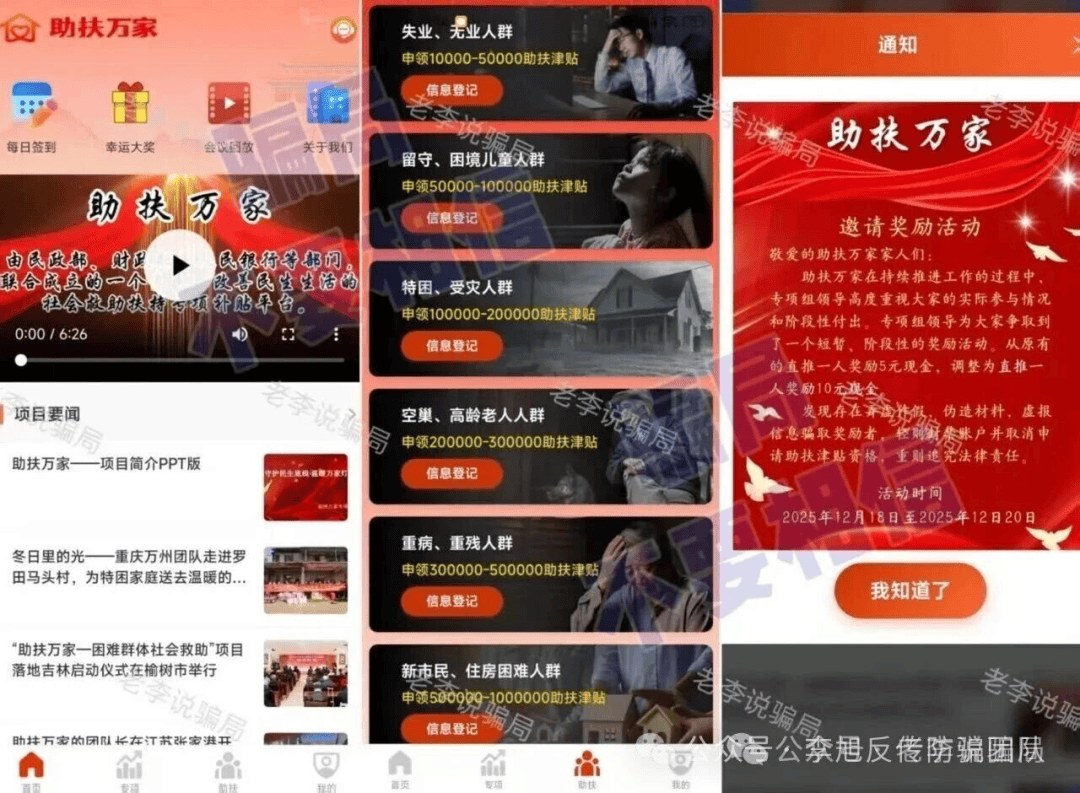 谎称“国家项目”,以“帮扶”名义吸引参与者,针对社会上各种类型的“困难群众”,设置不同金额的“助扶津贴”,完全符合“困难人群”当下急于解困的心理,属于非常有针对性的骗局。