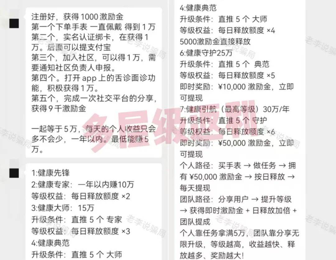项目将一款号称可检测健康的手表作为产品,宣称每日佩戴并完成实名注册、加入社区、参与面诊、分享平台等任务,即可获得5万元收益。并根据推荐人数划分等级, 并根据等级发放激励金和相应的每日释放额度。