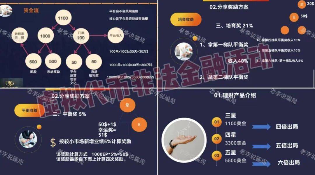 拆分盘模式。利用股票除权配股机制,声称通过“排队配股-拆分增股-会员点对点交易”循环进行运作。投资者需选择不同投资段位参与,对应“四倍至六倍出局”规则;同时设置多层奖励:分享奖、平衡奖、培育奖、幸运奖,另有小区业绩达标后的车房实物奖励。