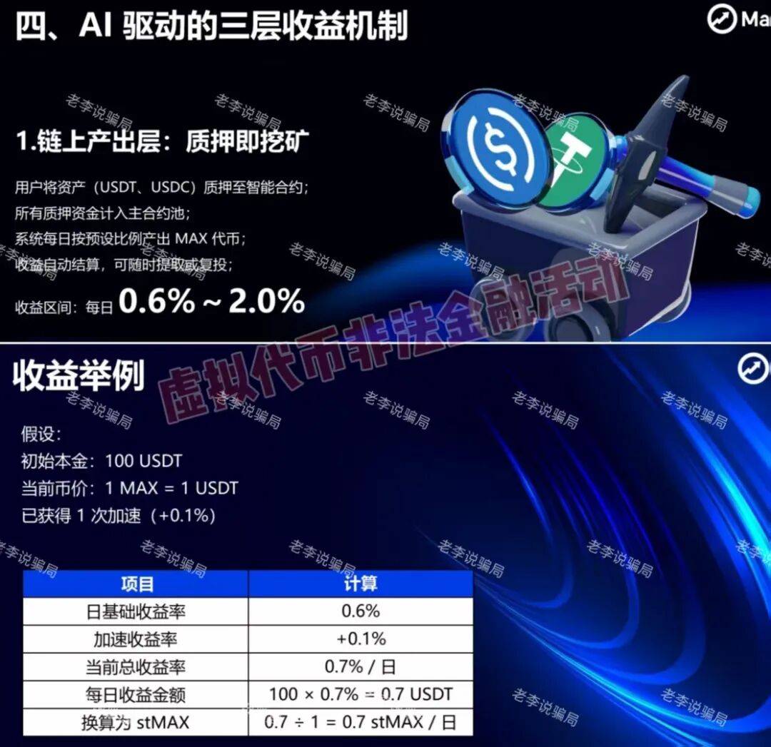 以“AI智能套利+DeFi生态”为噱头持续推广,宣称“低门槛、稳收益、自动化躺赚”,其制度设计融合了质押挖矿、层级奖励等机制,看似科技感十足,实则暗藏多重合规与资金风险。