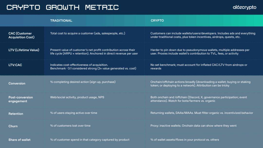 对于传统的 SaaS 产品来说,3:1 的比例被认为是合理的,因为这意味着你从客户身上创造的价值是获取客户成本的三倍,剩余的利润可以再投资于增长。在加密货币领域,我们还没有建立这样的基准。