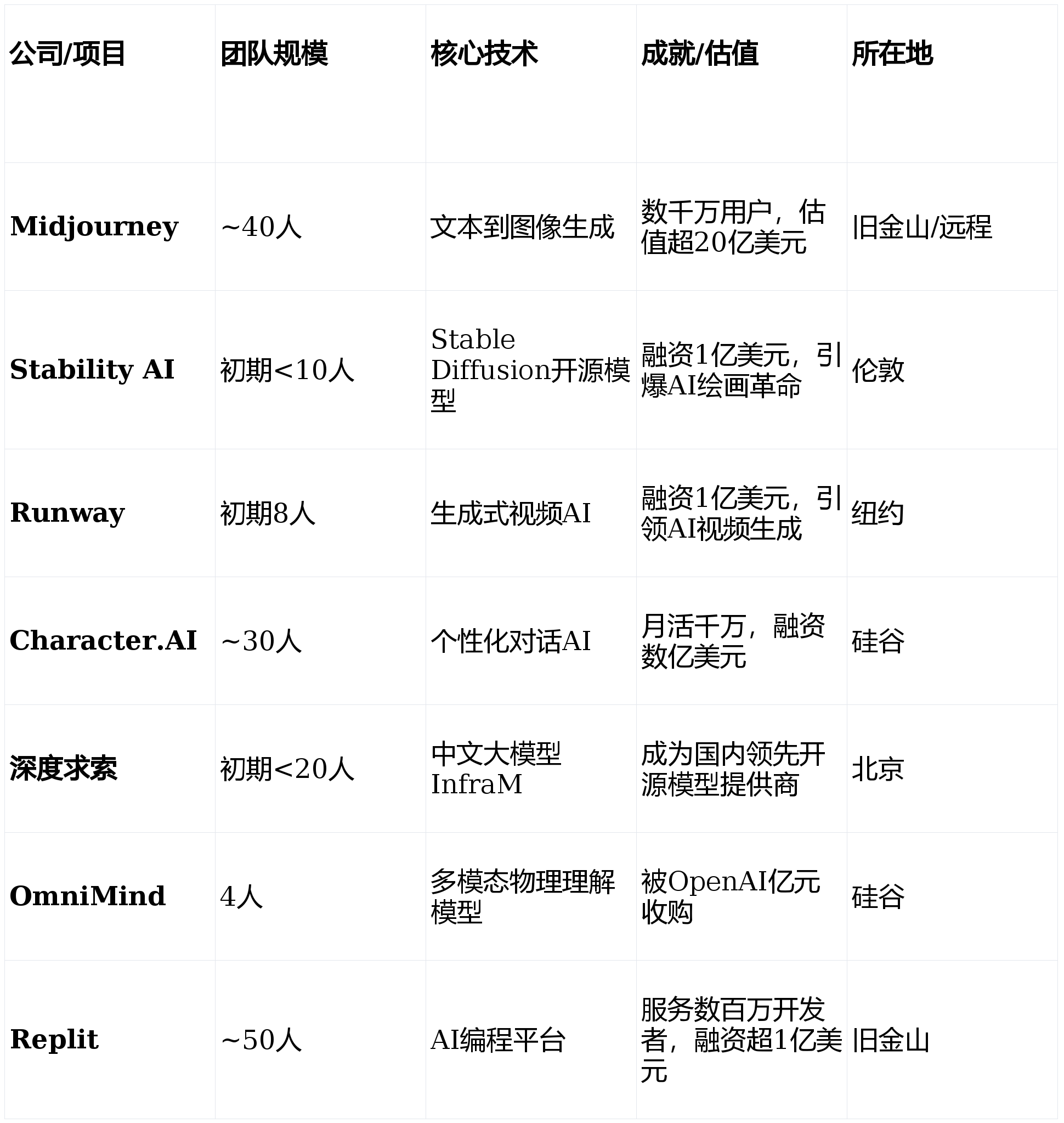 这并非孤例。去年,AI视频生成公司Runway的8人团队获得1亿美元融资;前年,开发出Stable Diffusion的Stability AI最初核心团队不足10人;而大名鼎鼎的Midjourney,至今保持约40人的精干规模,却创造了数十亿美元估值。