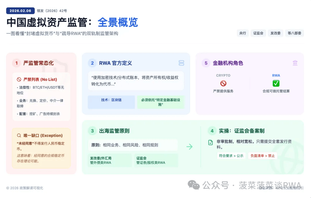 2021 年的 924 通知通篇围绕虚拟货币,彼时 RWA 这个概念在国内监管语境中几乎不存在。但 42 号文用了大量篇幅专门界定和规范 现实世界资产代币化 (RWA),这本身就是一个巨大的信号——监管层正式承认了 RWA 作为一种业务形态的存在,并且决定为它划定游戏规则,而不是一刀切地否定。