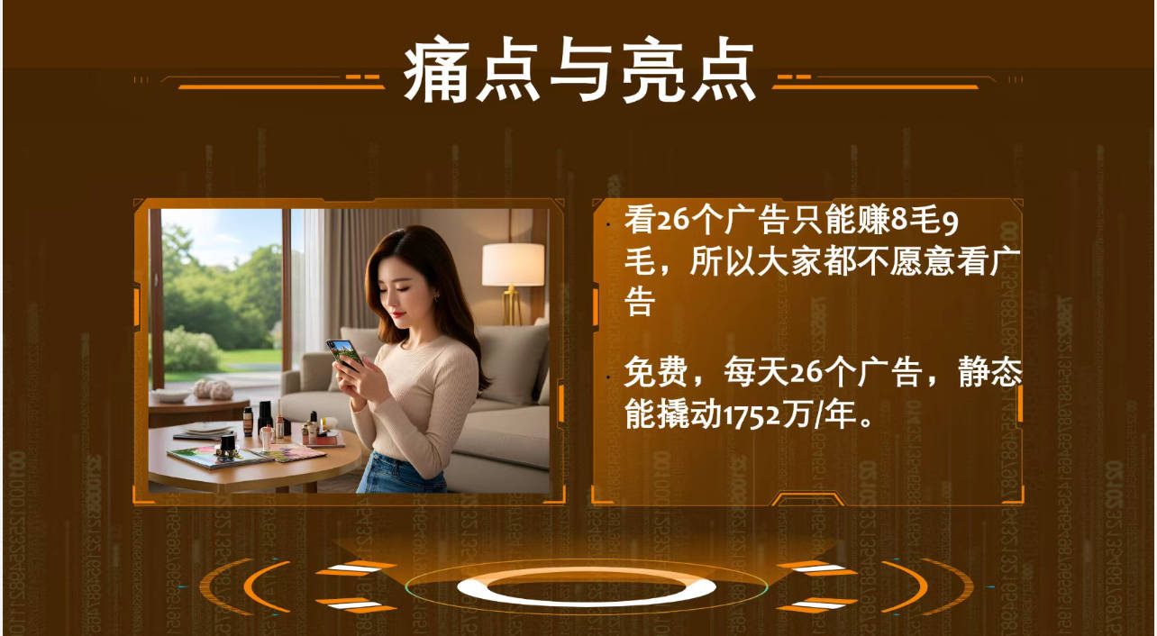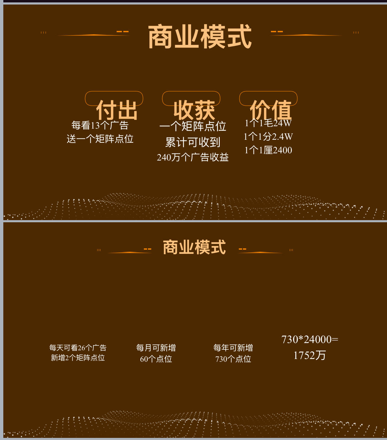 一个点位出局收益是2.4W,静态一年730个点位,如果全部出局就是1752W,不说全部出局,就算只出局1%那一年收益也有十几个W,记住哦这只是一年纯看广告的收益,还不算推广分享收益。